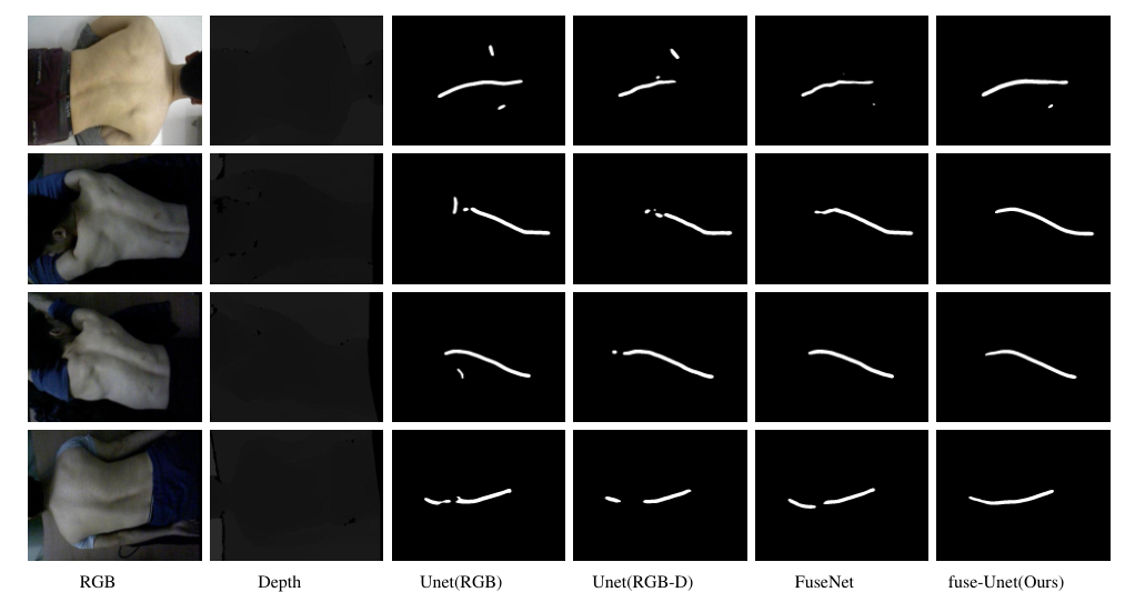 Fig 1.Visualization examples of the semantic segmentation compared with Unet and FuseNet.