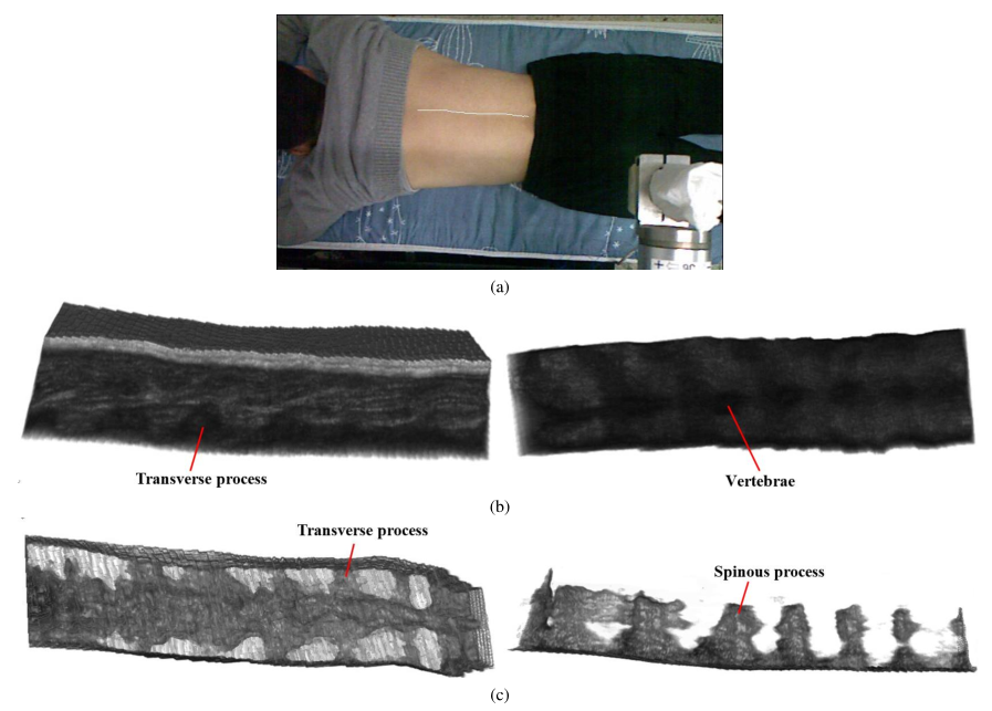 Fig 2. Experimental results in experiment using the linear probe. (a)Semantic segmentation result. (b)Side view and bottom view of the original reconstructed 3D spine volume. (c)Top view and side view of the spine volume with all the soft tissue removed.