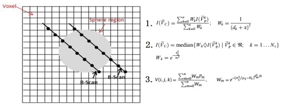 图10.本人提出的三类基于距离加权的三维超声重建算法。左:插值过程示意图;右:三种典型的插值计算公式。