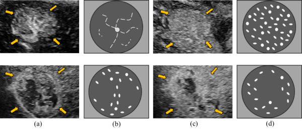 图20.非典型肝癌与良性肿瘤之间的图像语义差异, 上列为良性肿瘤,下列为非典型肝癌。(a) 动脉相肿瘤区域 (b) 轮辐状(上列)与混乱状(下列)。(c) 延迟相肿瘤区域 (d) 均匀增强 (上列)与不均匀增强(下列)